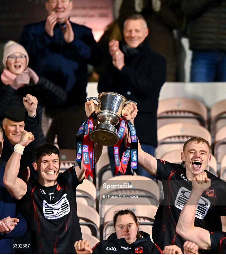30 November 2025; Ballygunner joint captains Peter Hogan, left, and Michael Mahony lift the cup after their side's victory in the AIB Munster GAA Hurling Senior Club Championship final match between Ballygunner and Éire Óg Ennis at FBD Semple Stadium in Thurles, Tipperary. Photo by Piaras Ó Mídheach/Sportsfile