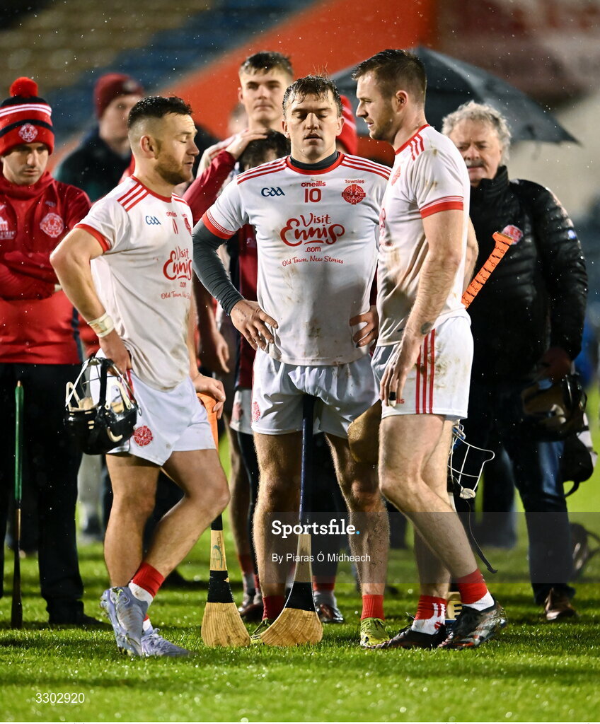 30 November 2025; Éire Óg Ennis players, from left, David Reidy, Shane O'Donnell and Ciarán Russell after their side's defeat in the AIB Munster GAA Hurling Senior Club Championship final match between Ballygunner and Éire Óg Ennis at FBD Semple Stadium in Thurles, Tipperary. Photo by Piaras Ó Mídheach/Sportsfile