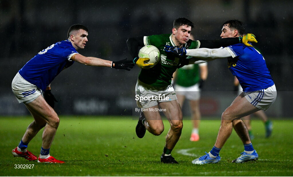 30 November 2025; Callum McGrogan of Newbridge is tackled by Micheal McCarville, left, and Donnchadh Connolly of Scotstown during the AIB Ulster GAA Football Senior Club Championship semi-final match between Scotstown and Newbridge at BOX-IT Athletic Grounds in Armagh. Photo by Ben McShane/Sportsfile