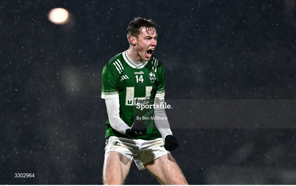 30 November 2025; Sean Young of Newbridge celebrates after kicking a two-point score during the AIB Ulster GAA Football Senior Club Championship semi-final match between Scotstown and Newbridge at BOX-IT Athletic Grounds in Armagh. Photo by Ben McShane/Sportsfile