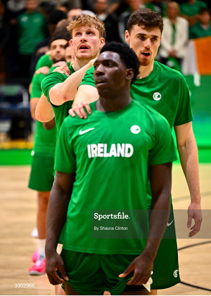 30 November 2025; Ireland players stand for the playing of Amhrán na bhFiann before the FIBA EuroBasket 2029 Pre-Qualifiers Group A match between Ireland and North Macedonia at the National Basketball Arena in Dublin. Photo by Shauna Clinton/Sportsfile
