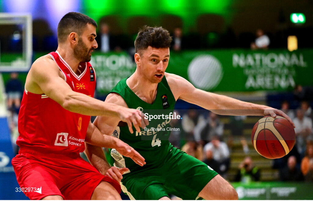 30 November 2025; Adrian O'Sullivan of Ireland in action against Andrej Magdevski of Macedonia during the FIBA EuroBasket 2029 Pre-Qualifiers Group A match between Ireland and North Macedonia at the National Basketball Arena in Dublin. Photo by Shauna Clinton/Sportsfile