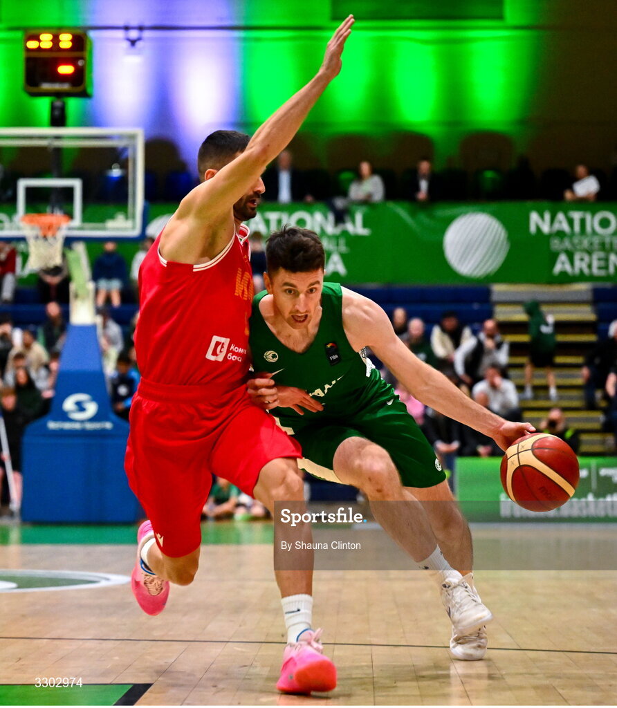 30 November 2025; Adrian O'Sullivan of Ireland in action against Andrej Magdevski of Macedonia during the FIBA EuroBasket 2029 Pre-Qualifiers Group A match between Ireland and North Macedonia at the National Basketball Arena in Dublin. Photo by Shauna Clinton/Sportsfile