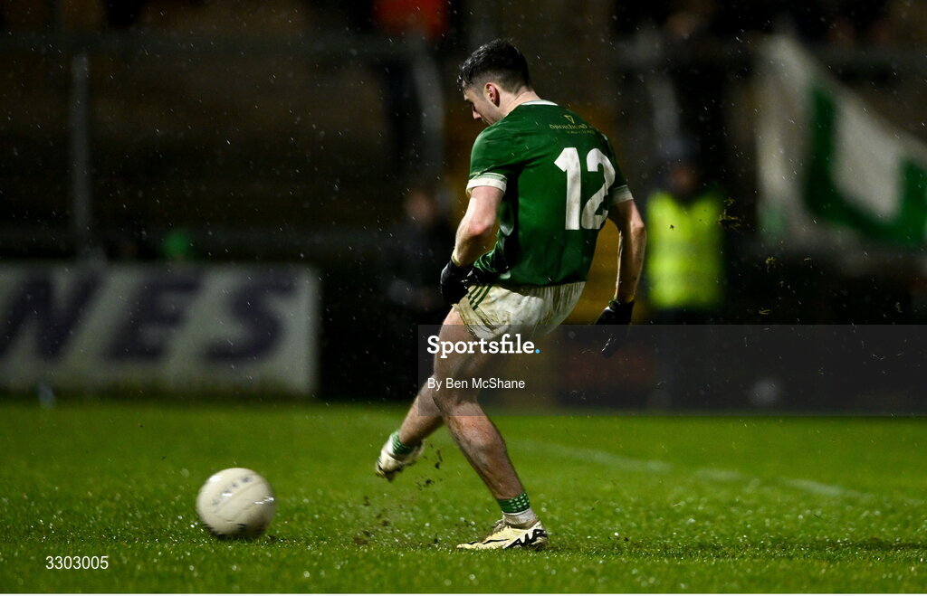 30 November 2025; Cathair McBride of Newbridge scores a penalty in the penalty shootout of the AIB Ulster GAA Football Senior Club Championship semi-final match between Scotstown and Newbridge at BOX-IT Athletic Grounds in Armagh. Photo by Ben McShane/Sportsfile