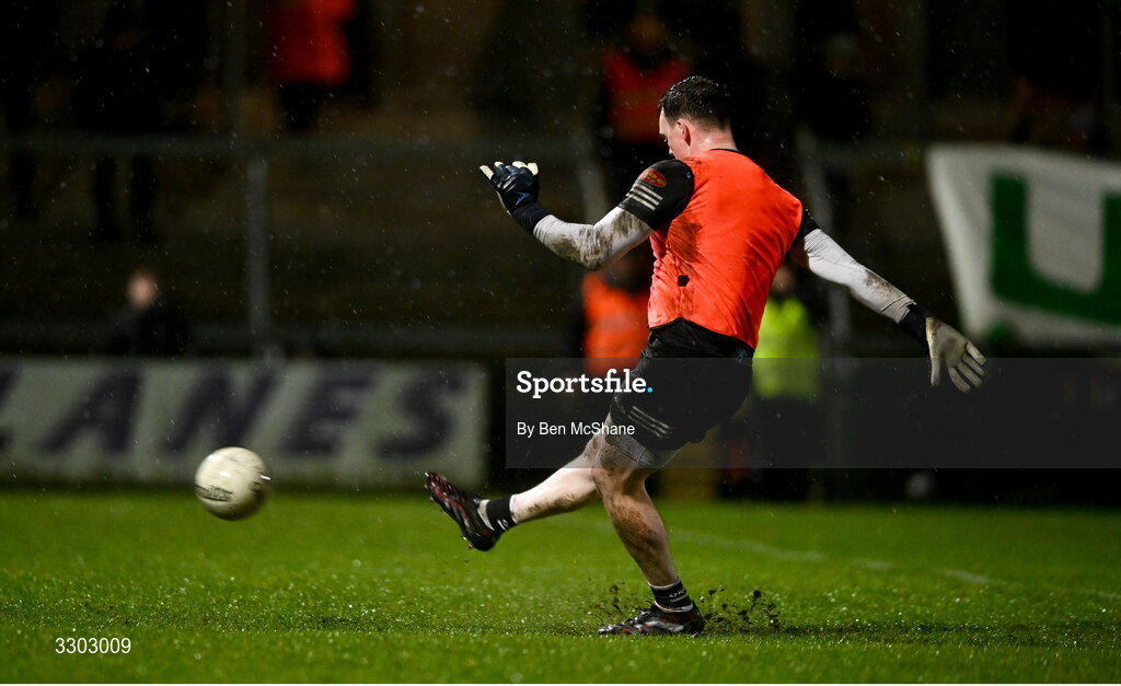 30 November 2025; Scotstown goalkeeper Rory Beggan scores a penalty in the penalty shootout of the AIB Ulster GAA Football Senior Club Championship semi-final match between Scotstown and Newbridge at BOX-IT Athletic Grounds in Armagh. Photo by Ben McShane/Sportsfile