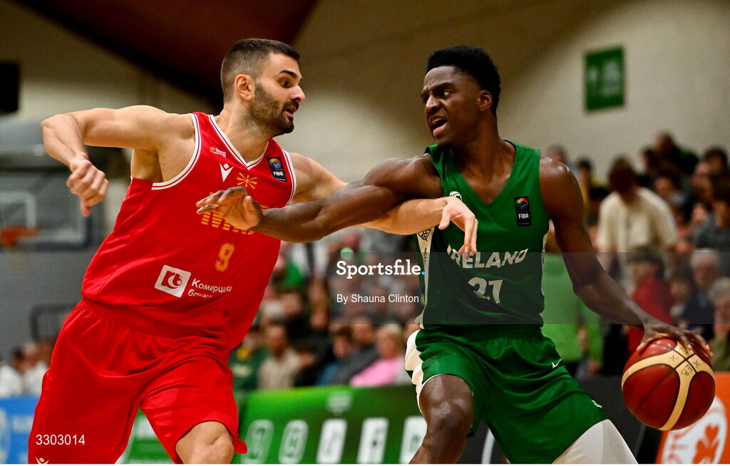 30 November 2025; Taiwo Badmus of Ireland in action against Andrej Jakimovski of North Macedonia during the FIBA EuroBasket 2029 Pre-Qualifiers Group A match between Ireland and North Macedonia at the National Basketball Arena in Dublin. Photo by Shauna Clinton/Sportsfile
