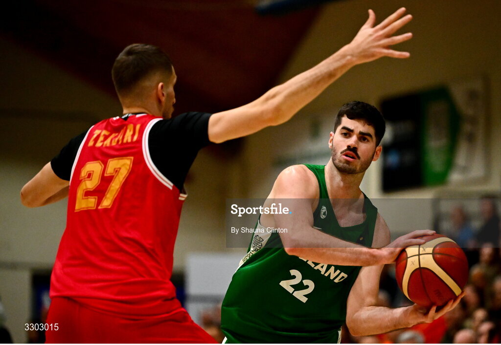 30 November 2025; Matt Treacy of Ireland in action against Lejson Zeqiri of North Macedonia during the FIBA EuroBasket 2029 Pre-Qualifiers Group A match between Ireland and North Macedonia at the National Basketball Arena in Dublin. Photo by Shauna Clinton/Sportsfile