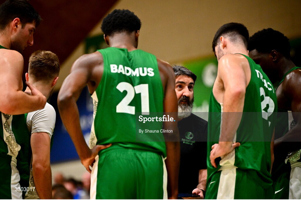 30 November 2025; Ireland coach Michael Breen, centre, speaks to players during the FIBA EuroBasket 2029 Pre-Qualifiers Group A match between Ireland and North Macedonia at the National Basketball Arena in Dublin. Photo by Shauna Clinton/Sportsfile