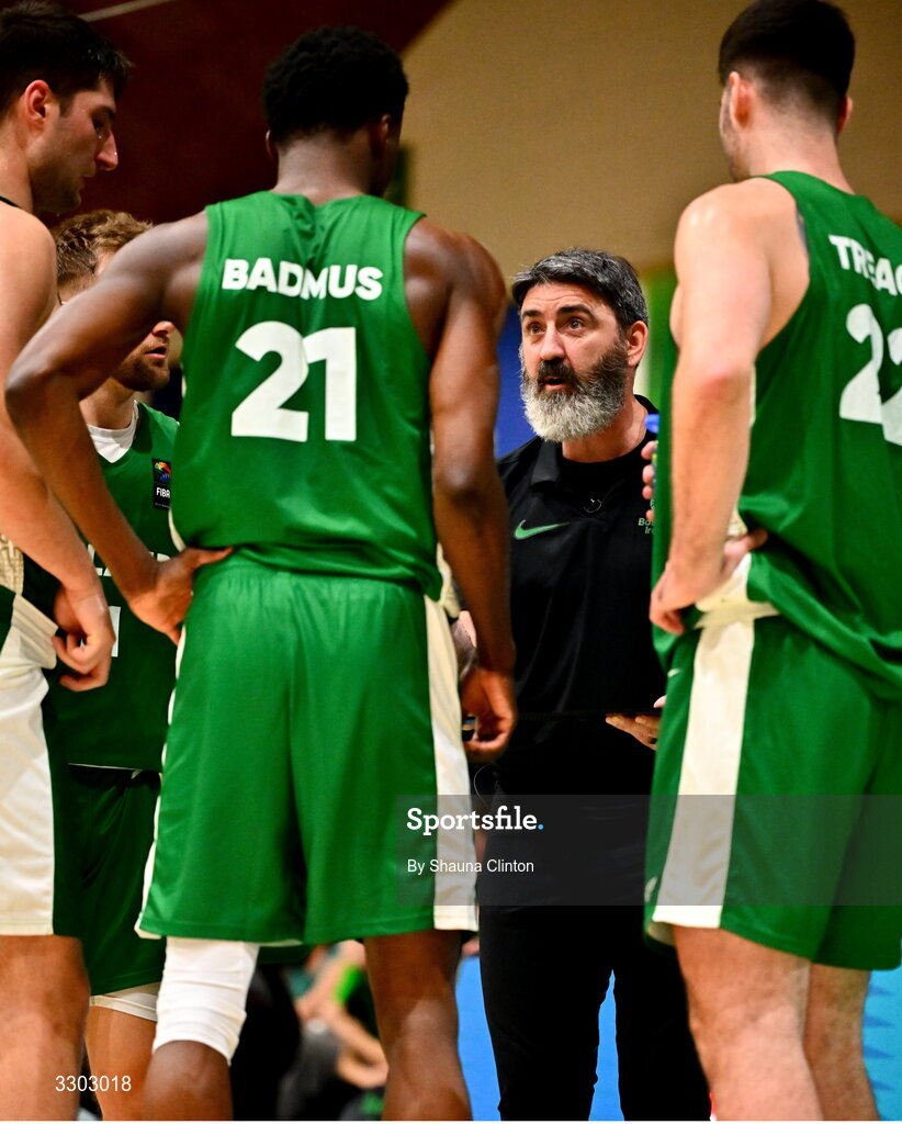 30 November 2025; Ireland coach Michael Breen, centre, speaks to players during the FIBA EuroBasket 2029 Pre-Qualifiers Group A match between Ireland and North Macedonia at the National Basketball Arena in Dublin. Photo by Shauna Clinton/Sportsfile