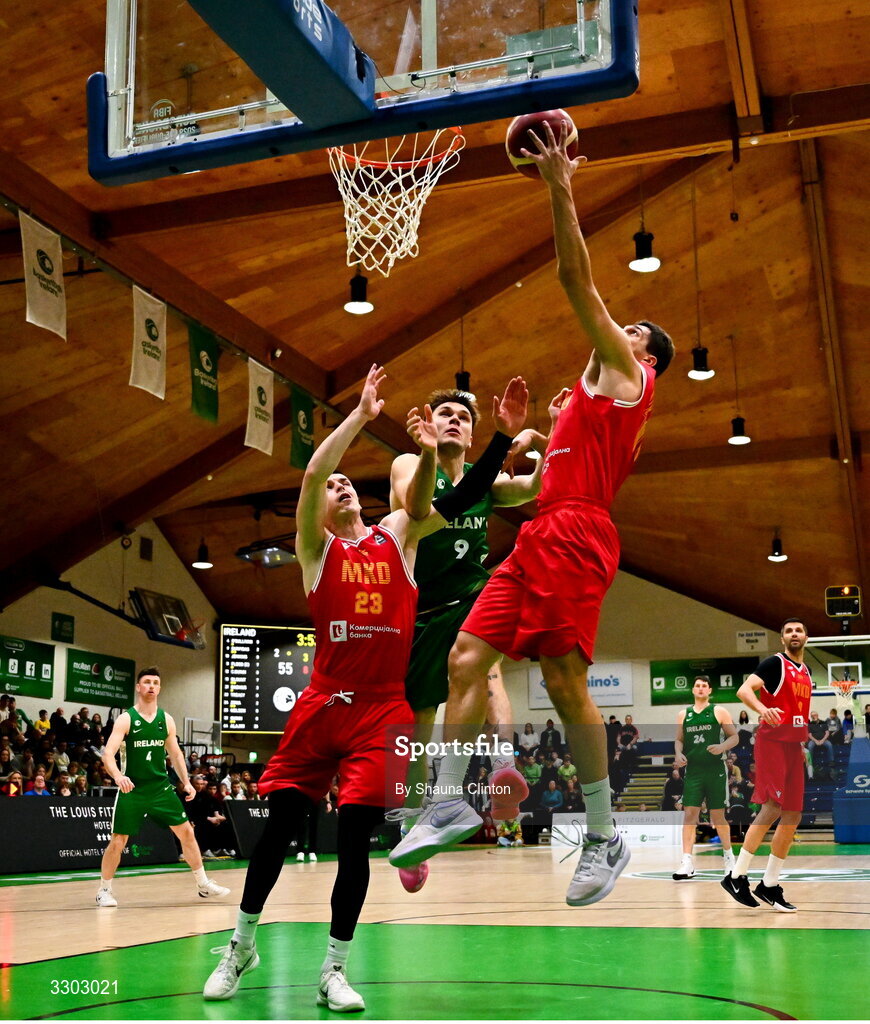 30 November 2025; Rapolas Buivydas of Ireland in action against Adem Mekic of North Macedonia during the FIBA EuroBasket 2029 Pre-Qualifiers Group A match between Ireland and North Macedonia at the National Basketball Arena in Dublin. Photo by Shauna Clinton/Sportsfile