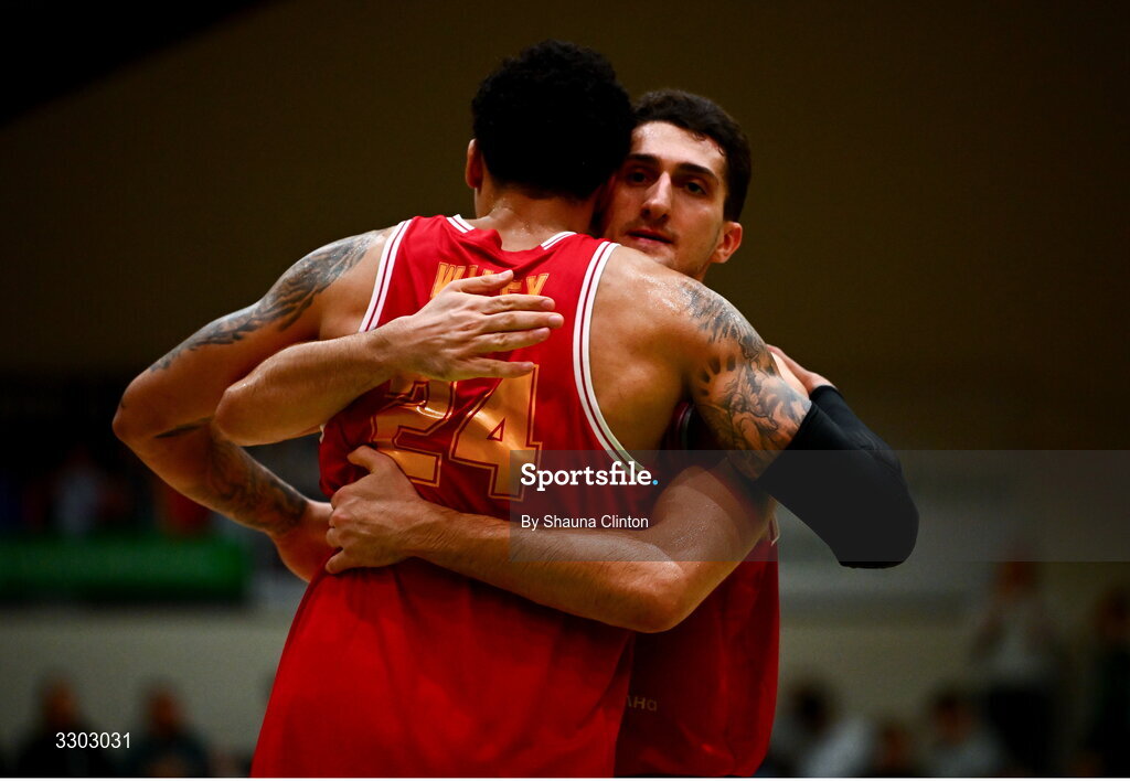 30 November 2025; Adem Mekic of North Macedonia, right, celebrates with team-mate Jacob Wiley after their side's victory in the FIBA EuroBasket 2029 Pre-Qualifiers Group A match between Ireland and North Macedonia at the National Basketball Arena in Dublin. Photo by Shauna Clinton/Sportsfile