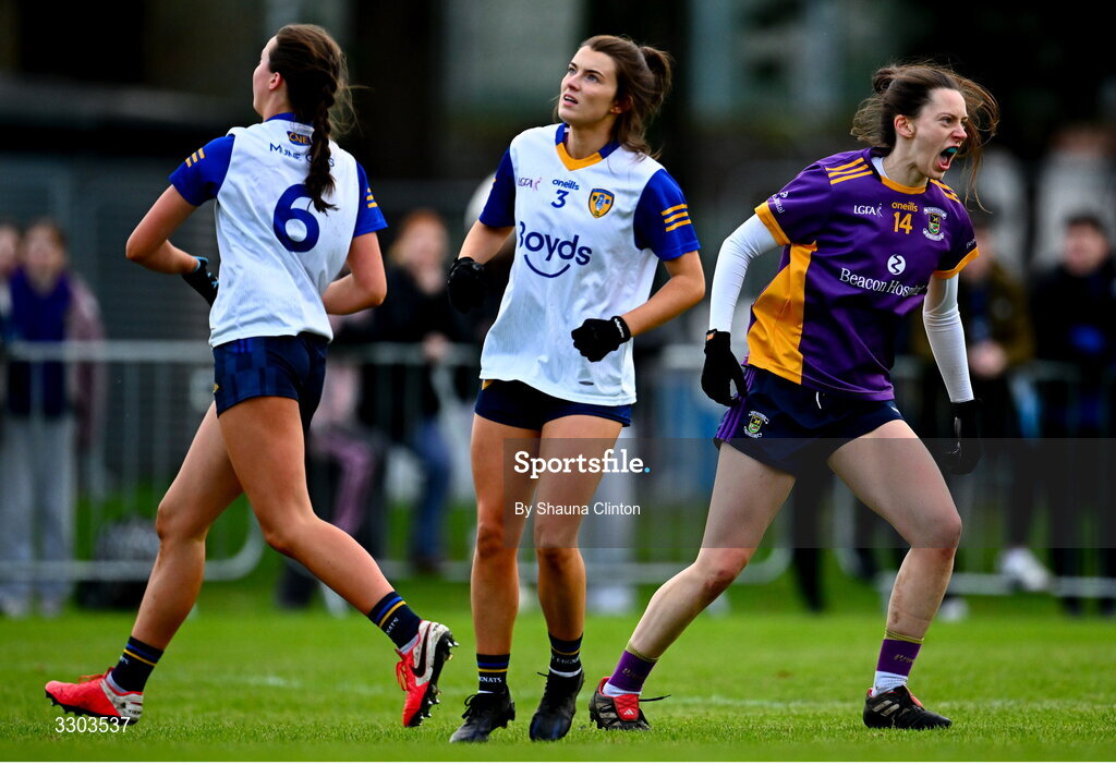 30 November 2025; Michelle Davoren of Kilmacud Crokes reacts after her side scores during the 2025 AIB All-Ireland Ladies Football Club Senior Club Championship semi-final match between Kilmacud Crokes of Dublin and St Ergnat’s of Antrim at Páirc de Burca in Stillorgan, Dublin. Photo by Shauna Clinton/Sportsfile