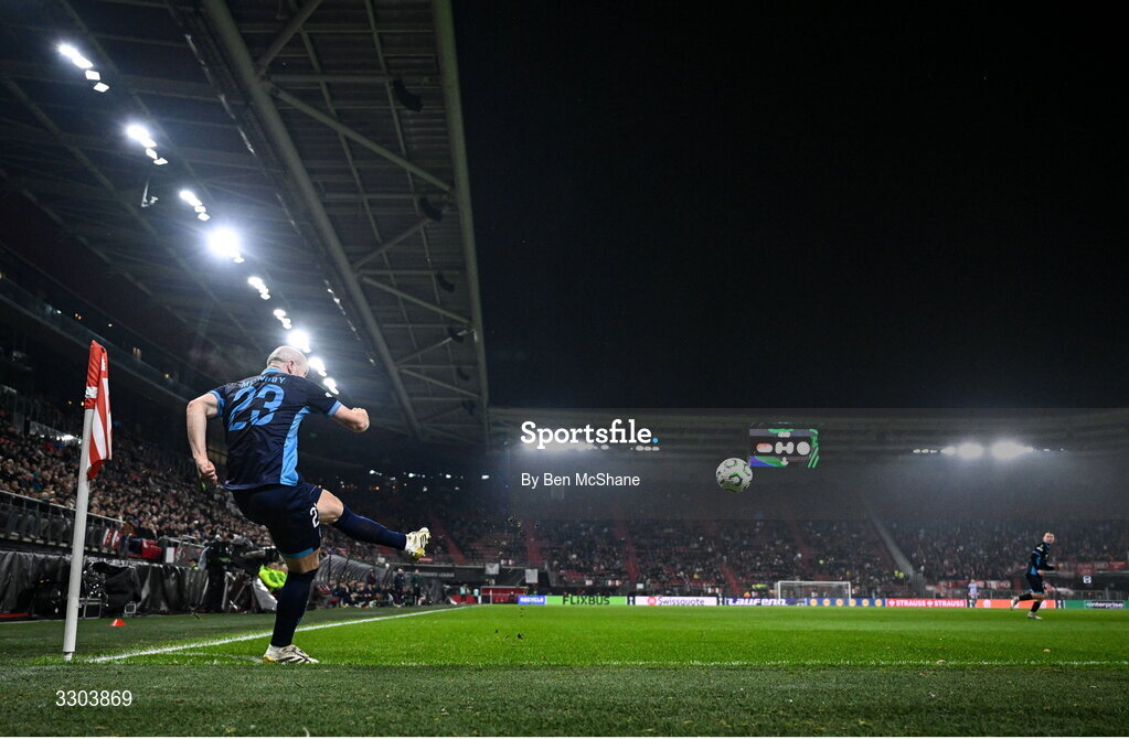 27 November 2025; Kerr McInroy of Shelbourne takes a corner during the UEFA Conference League 2025/26 league phase match between AZ Alkmaar and Shelbourne at AFAS Stadion in Alkmaar, Netherlands. Photo by Ben McShane/Sportsfile