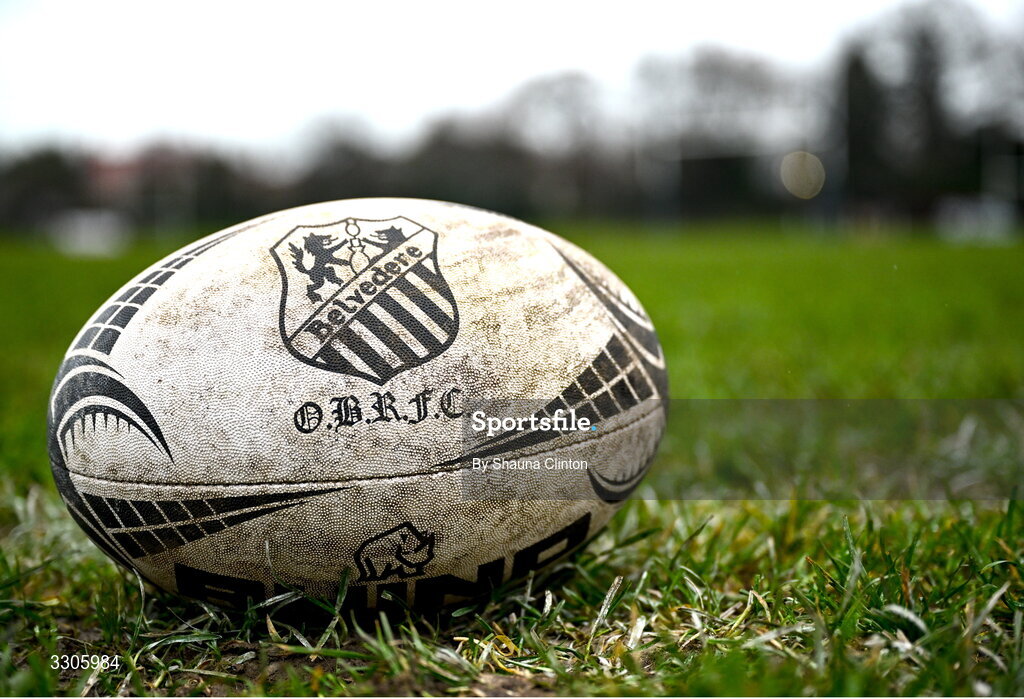 7 December 2025; A general view of a rugby ball before the Bank of Ireland JP Fanagan U20s league match between Old Belvedere RFC and MU Barnhall RFC at Ollie Campbell Park in Dublin. Photo by Shauna Clinton/Sportsfile