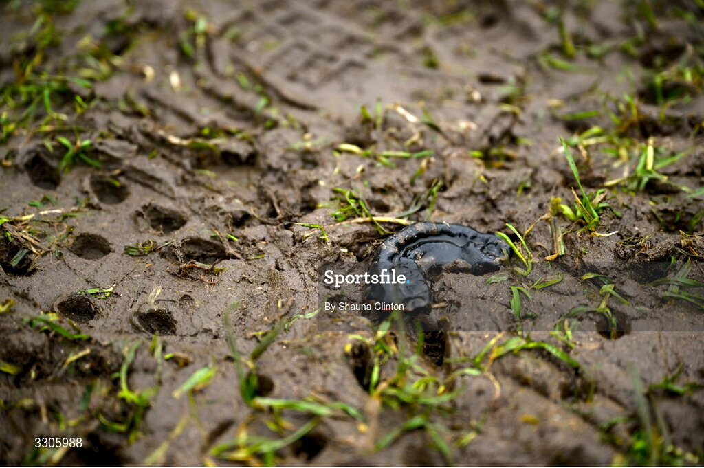 7 December 2025; A gum shield is seen in mud before the Bank of Ireland JP Fanagan U20s league match between Old Belvedere RFC and MU Barnhall RFC at Ollie Campbell Park in Dublin. Photo by Shauna Clinton/Sportsfile