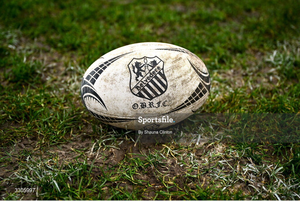 7 December 2025; A general view of a rugby ball before the Bank of Ireland JP Fanagan U20s league match between Old Belvedere RFC and MU Barnhall RFC at Ollie Campbell Park in Dublin. Photo by Shauna Clinton/Sportsfile