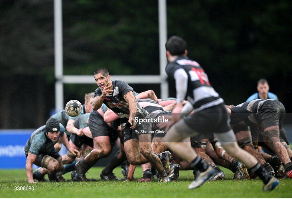 7 December 2025; Christopher O'Connor of Old Belvedere RFC clears a scrum by passing to team-mate Cathal Lydon during the Bank of Ireland JP Fanagan U20s league match between Old Belvedere RFC and MU Barnhall RFC at Ollie Campbell Park in Dublin. Photo by Shauna Clinton/Sportsfile