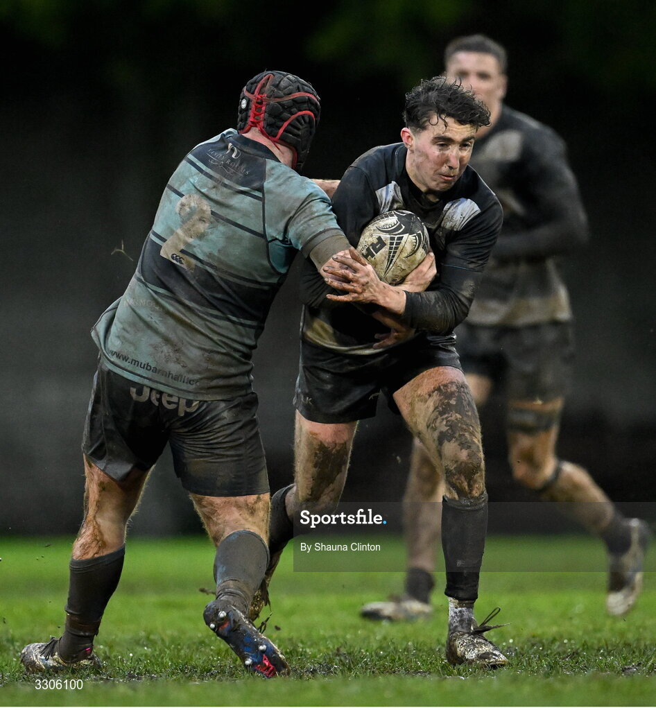 7 December 2025; Finn Byrne of Old Belvedere RFC is tackled by Eoin O'Doherty of MU Barnhall RFC during the Bank of Ireland JP Fanagan U20s league match between Old Belvedere RFC and MU Barnhall RFC at Ollie Campbell Park in Dublin. Photo by Shauna Clinton/Sportsfile