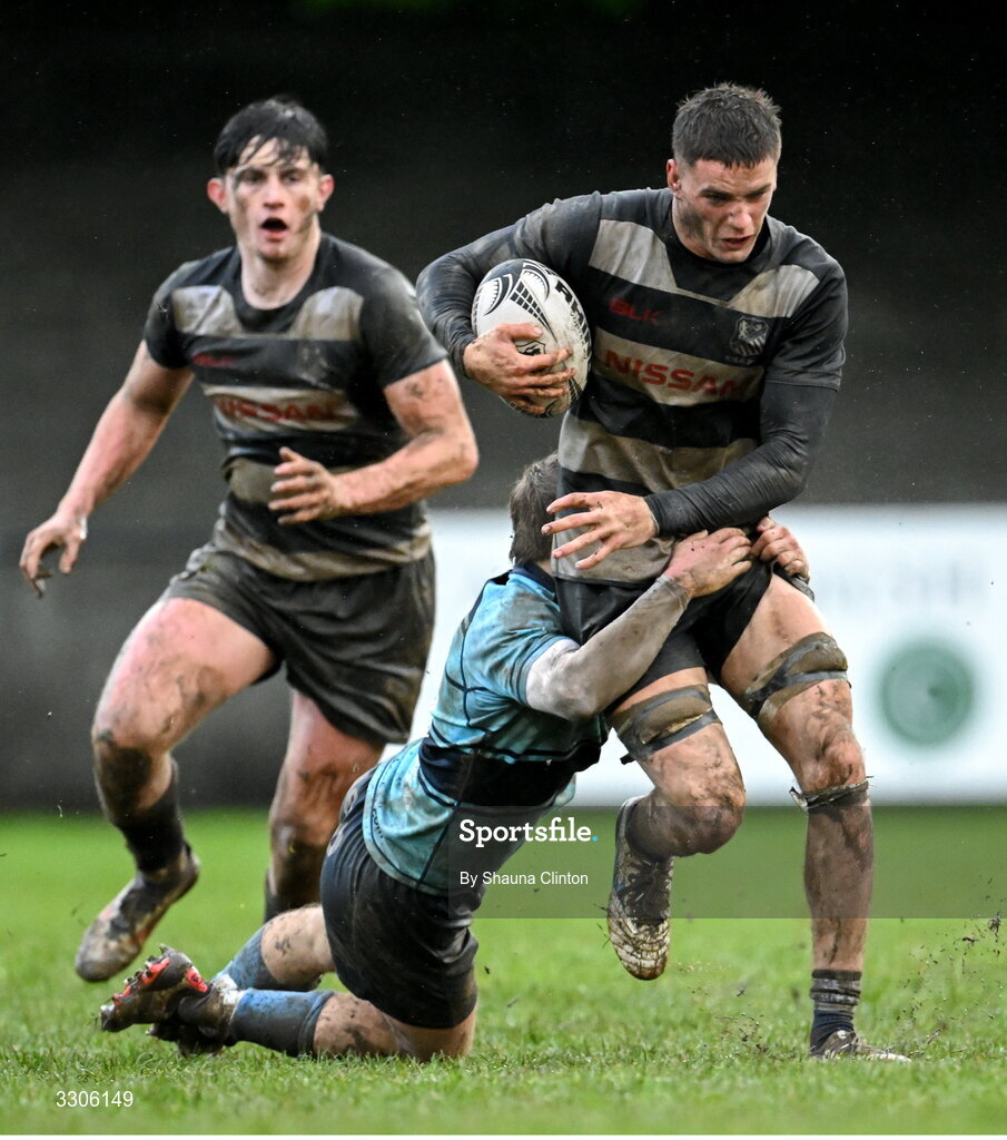 7 December 2025; Harvey Leonard of Old Belvedere RFC is tackled by Ivor Fenton of MU Barnhall RFC during the Bank of Ireland JP Fanagan U20s league match between Old Belvedere RFC and MU Barnhall RFC at Ollie Campbell Park in Dublin. Photo by Shauna Clinton/Sportsfile