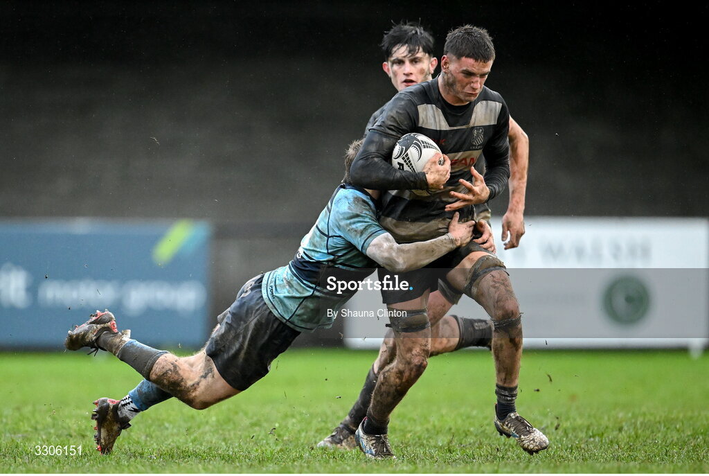 7 December 2025; Harvey Leonard of Old Belvedere RFC is tackled by Ivor Fenton of MU Barnhall RFC during the Bank of Ireland JP Fanagan U20s league match between Old Belvedere RFC and MU Barnhall RFC at Ollie Campbell Park in Dublin. Photo by Shauna Clinton/Sportsfile