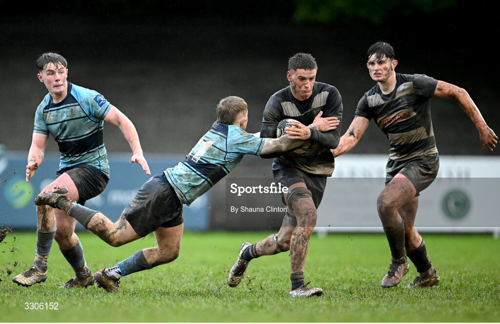 7 December 2025; Harvey Leonard of Old Belvedere RFC is tackled by Ivor Fenton of MU Barnhall RFC during the Bank of Ireland JP Fanagan U20s league match between Old Belvedere RFC and MU Barnhall RFC at Ollie Campbell Park in Dublin. Photo by Shauna Clinton/Sportsfile