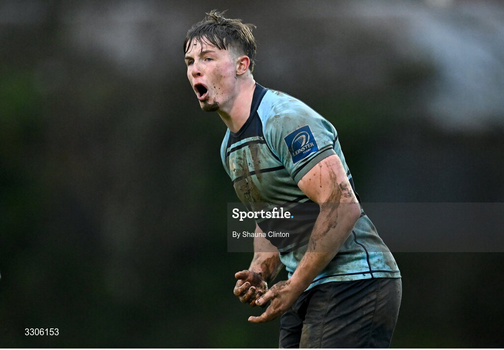 7 December 2025; Alexander Crowley of MU Barnhall RFC reacts during the Bank of Ireland JP Fanagan U20s league match between Old Belvedere RFC and MU Barnhall RFC at Ollie Campbell Park in Dublin. Photo by Shauna Clinton/Sportsfile