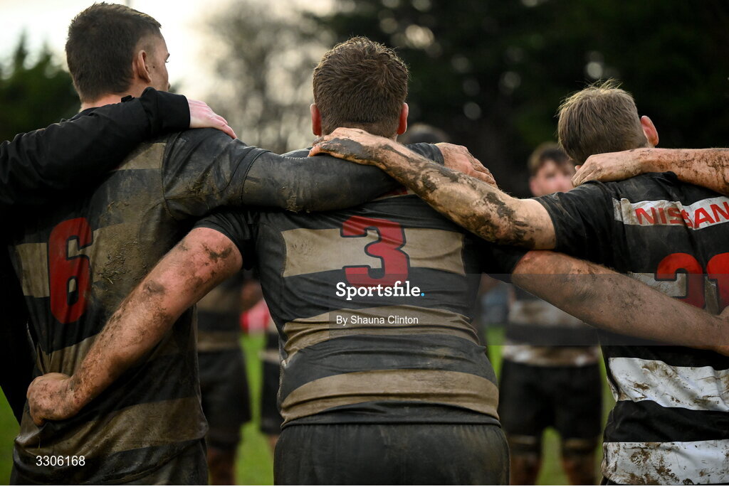 7 December 2025; Old Belvedere RFC players huddle after their side's defeat in the Bank of Ireland JP Fanagan U20s league match between Old Belvedere RFC and MU Barnhall RFC at Ollie Campbell Park in Dublin. Photo by Shauna Clinton/Sportsfile