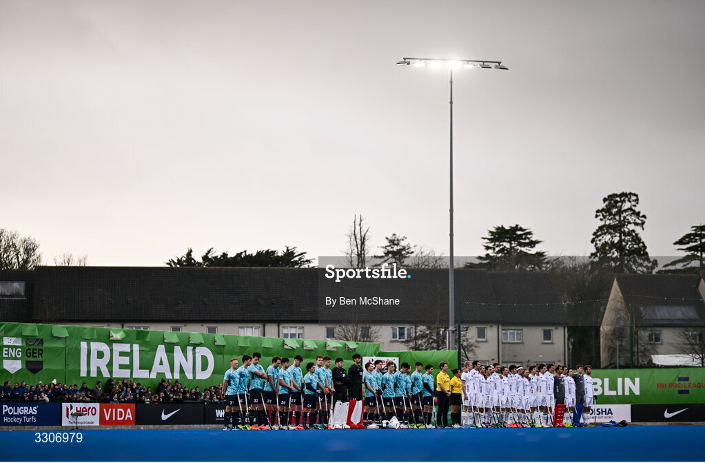 10 December 2025; Players and officials line-up before the FIH Men's Hockey Pro League match between England and Germany at the Sport Ireland Campus in Dublin. Photo by Ben McShane/Sportsfile