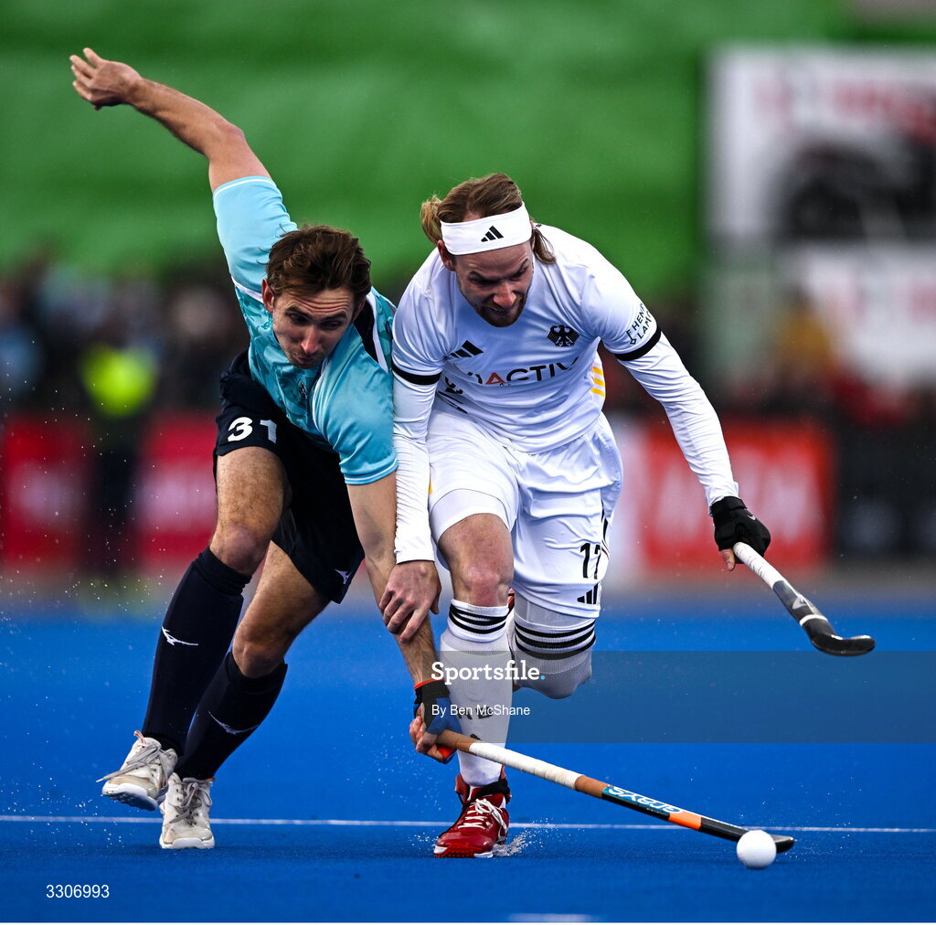 10 December 2025; Christopher Rühr of Germany in action against Will Calnan of England during the FIH Men's Hockey Pro League match between England and Germany at the Sport Ireland Campus in Dublin. Photo by Ben McShane/Sportsfile