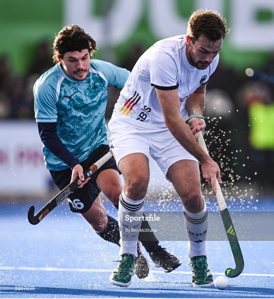 10 December 2025; Justus Weigand of Germany in action against James Gall of England during the FIH Men's Hockey Pro League match between England and Germany at the Sport Ireland Campus in Dublin. Photo by Ben McShane/Sportsfile
