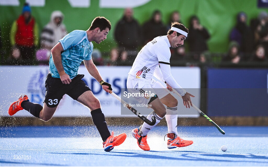 10 December 2025; Elian Mazkour of Germany in action against Samuel Hooper of England during the FIH Men's Hockey Pro League match between England and Germany at the Sport Ireland Campus in Dublin. Photo by Ben McShane/Sportsfile