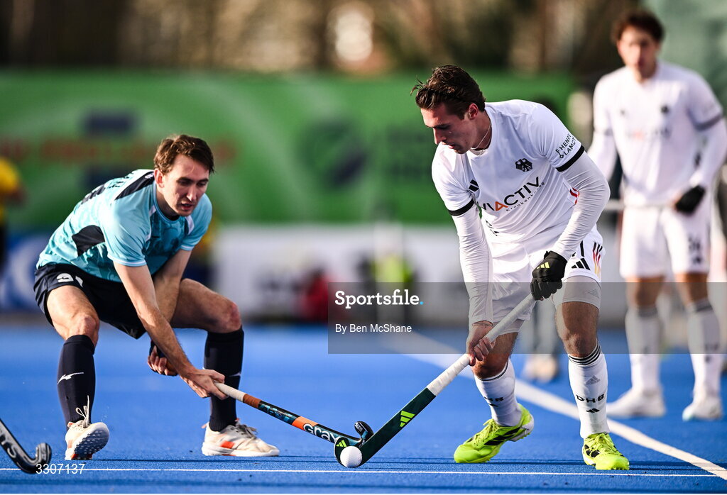 10 December 2025; Matteo Poljaric of Germany and Will Calnan of England during the FIH Men's Hockey Pro League match between England and Germany at the Sport Ireland Campus in Dublin. Photo by Ben McShane/Sportsfile