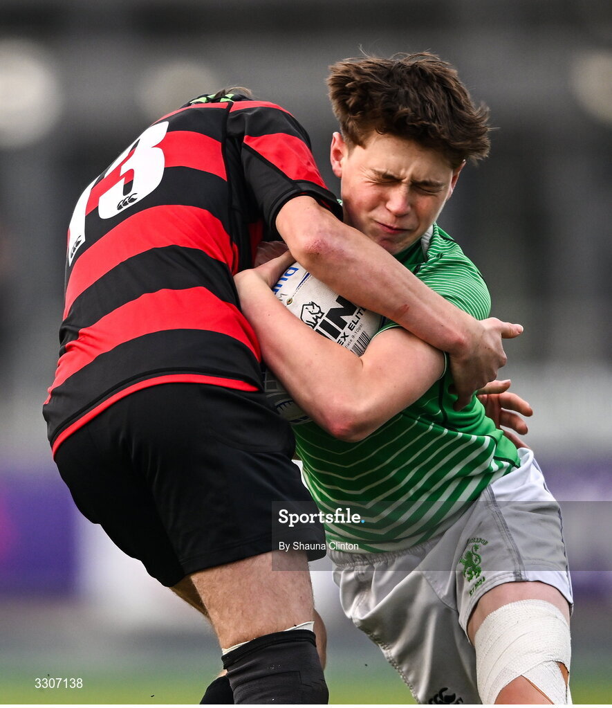 10 December 2025; Daniel Friel of Gonzaga College is tackled by William Myers of Kilkenny College during the Bank of Ireland Leinster Rugby Schools Junior League Division 1A final match between Gonzaga College and Kilkenny College at Energia Park in Dublin. Photo by Shauna Clinton/Sportsfile