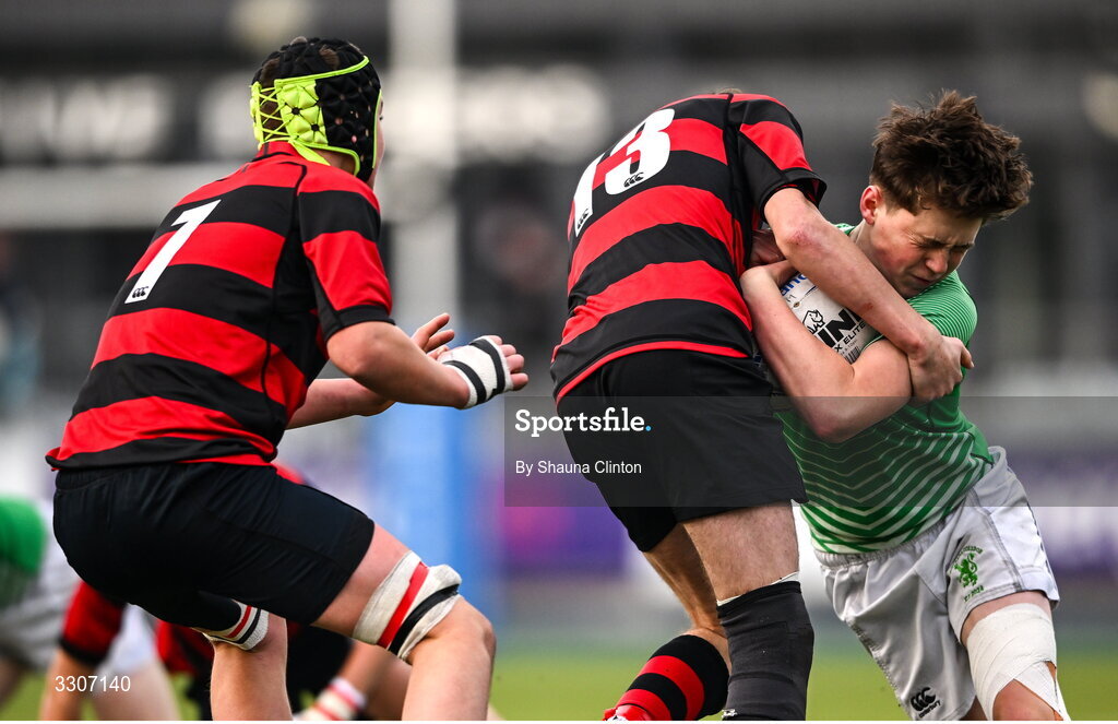10 December 2025; Daniel Friel of Gonzaga College is tackled by William Myers of Kilkenny College during the Bank of Ireland Leinster Rugby Schools Junior League Division 1A final match between Gonzaga College and Kilkenny College at Energia Park in Dublin. Photo by Shauna Clinton/Sportsfile