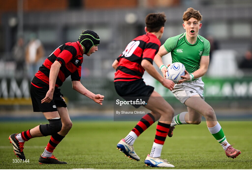 10 December 2025; Jamie Bluett of Gonzaga College in action against Sonny McGlynn of Kilkenny College during the Bank of Ireland Leinster Rugby Schools Junior League Division 1A final match between Gonzaga College and Kilkenny College at Energia Park in Dublin. Photo by Shauna Clinton/Sportsfile