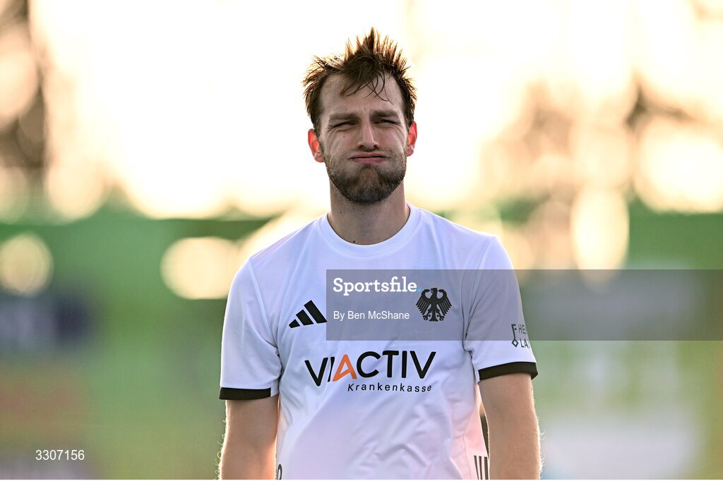 10 December 2025; Florian Sperling of Germany reacts during the FIH Men's Hockey Pro League match between England and Germany at the Sport Ireland Campus in Dublin. Photo by Ben McShane/Sportsfile
