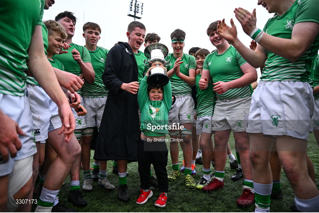 10 December 2025; Gonzaga College players celebrate with supporter Sam Burke after their side's victory in the Bank of Ireland Leinster Rugby Schools Junior League Division 1A final match between Gonzaga College and Kilkenny College at Energia Park in Dublin. Photo by Shauna Clinton/Sportsfile