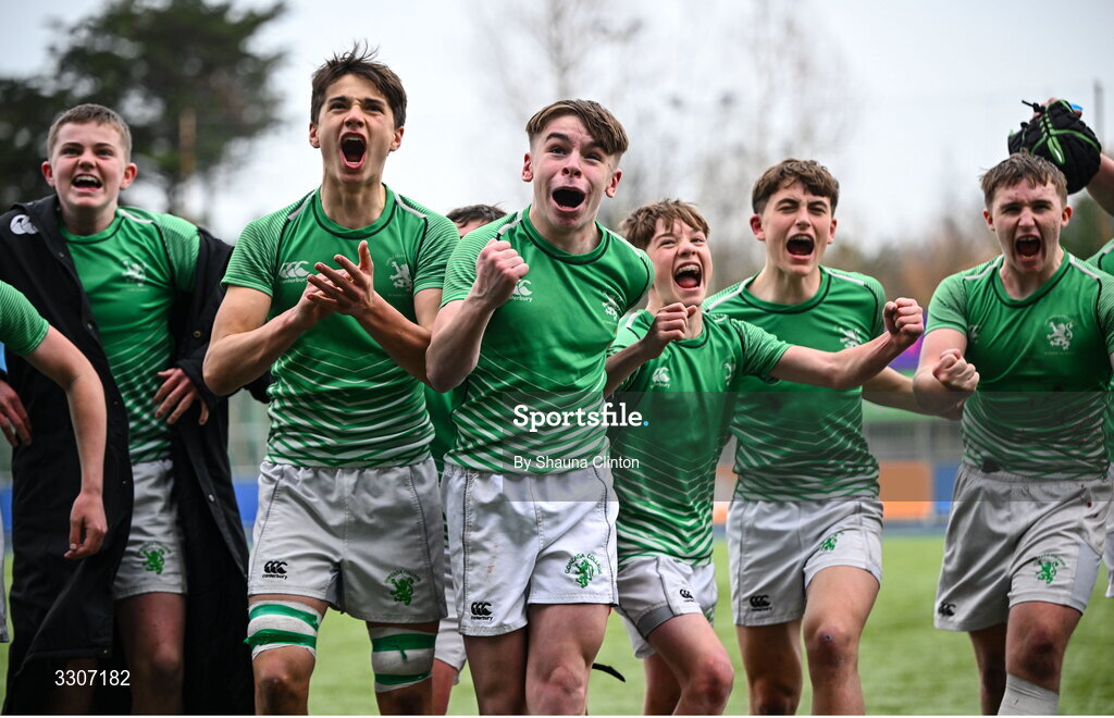 10 December 2025; Gonzaga College players, including Sean Fahey, celebrate after their side's victory in the Bank of Ireland Leinster Rugby Schools Junior League Division 1A final match between Gonzaga College and Kilkenny College at Energia Park in Dublin. Photo by Shauna Clinton/Sportsfile
