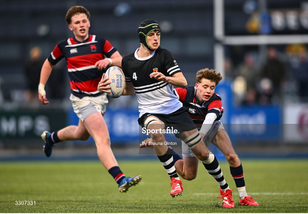 10 December 2025; Jack Garvey of Newbridge College in action against Zach Sidebottom of Wesley College during the Bank of Ireland Leinster Rugby Schools Senior League Division 1A final match between Newbridge College and Wesley College at Energia Park in Dublin. Photo by Shauna Clinton/Sportsfile