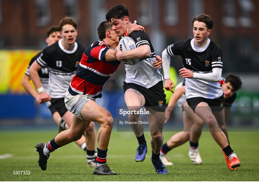 10 December 2025; Luke Kelly of Newbridge College in action against Nathan Heatley of Wesley College during the Bank of Ireland Leinster Rugby Schools Senior League Division 1A final match between Newbridge College and Wesley College at Energia Park in Dublin. Photo by Shauna Clinton/Sportsfile