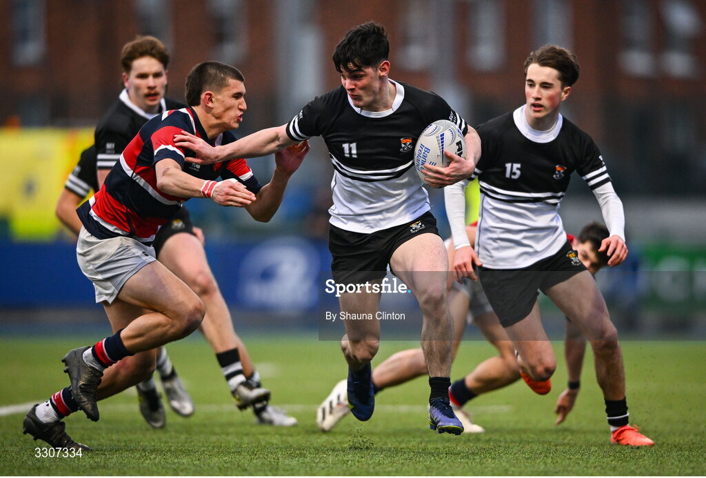 10 December 2025; Luke Kelly of Newbridge College in action against Nathan Heatley of Wesley College during the Bank of Ireland Leinster Rugby Schools Senior League Division 1A final match between Newbridge College and Wesley College at Energia Park in Dublin. Photo by Shauna Clinton/Sportsfile