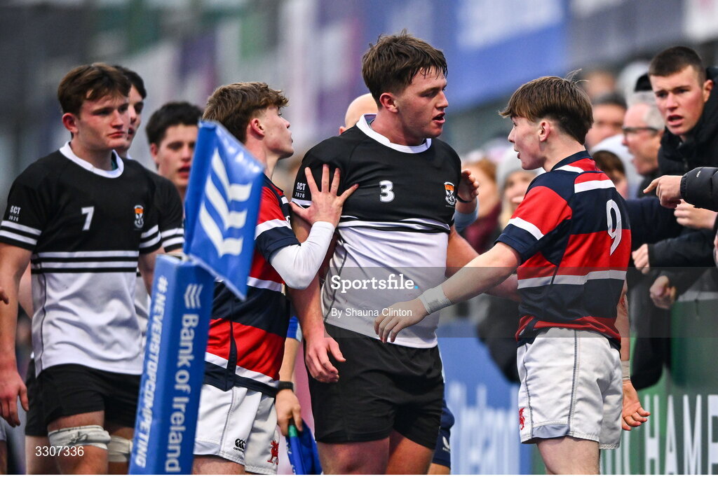 10 December 2025; Jamie Bohan of Newbridge College and Johnny Woods of Wesley College tussle during the Bank of Ireland Leinster Rugby Schools Senior League Division 1A final match between Newbridge College and Wesley College at Energia Park in Dublin. Photo by Shauna Clinton/Sportsfile