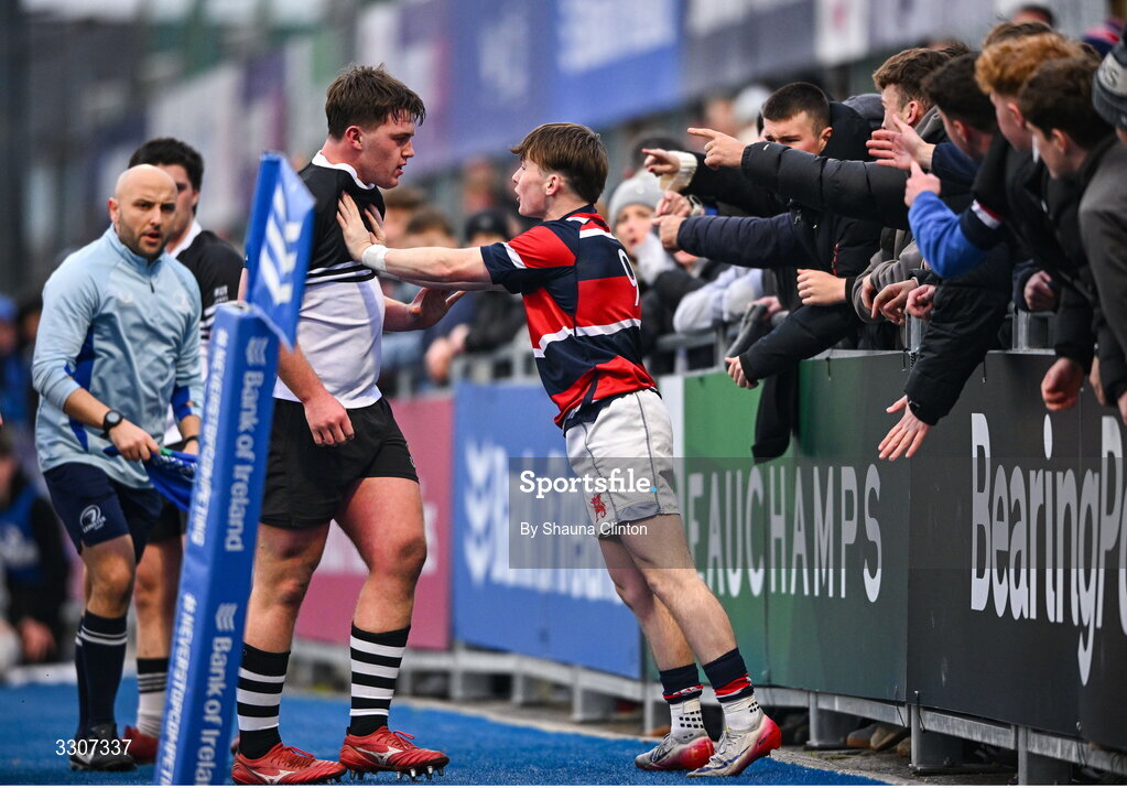 10 December 2025; Jamie Bohan of Newbridge College and Johnny Woods of Wesley College tussle during the Bank of Ireland Leinster Rugby Schools Senior League Division 1A final match between Newbridge College and Wesley College at Energia Park in Dublin. Photo by Shauna Clinton/Sportsfile