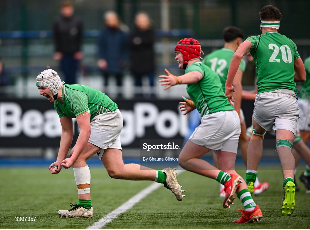10 December 2025; Gonzaga College players celebrate at the final whistle of the Bank of Ireland Leinster Rugby Schools Junior League Division 1A final match between Gonzaga College and Kilkenny College at Energia Park in Dublin. Photo by Shauna Clinton/Sportsfile