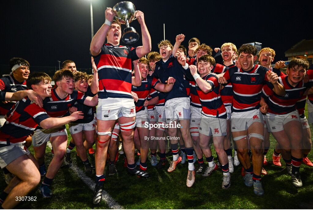 10 December 2025; Wesley College players, including Isaac Reid, centre, celebrate with the cup after their side's victory in the Bank of Ireland Leinster Rugby Schools Senior League Division 1A final match between Newbridge College and Wesley College at Energia Park in Dublin. Photo by Shauna Clinton/Sportsfile