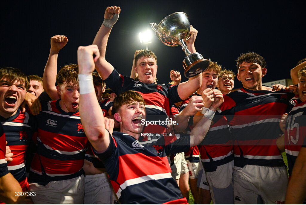 10 December 2025; Wesley College players, including Isaac Reid, centre, celebrate with the cup after their side's victory in the Bank of Ireland Leinster Rugby Schools Senior League Division 1A final match between Newbridge College and Wesley College at Energia Park in Dublin. Photo by Shauna Clinton/Sportsfile
