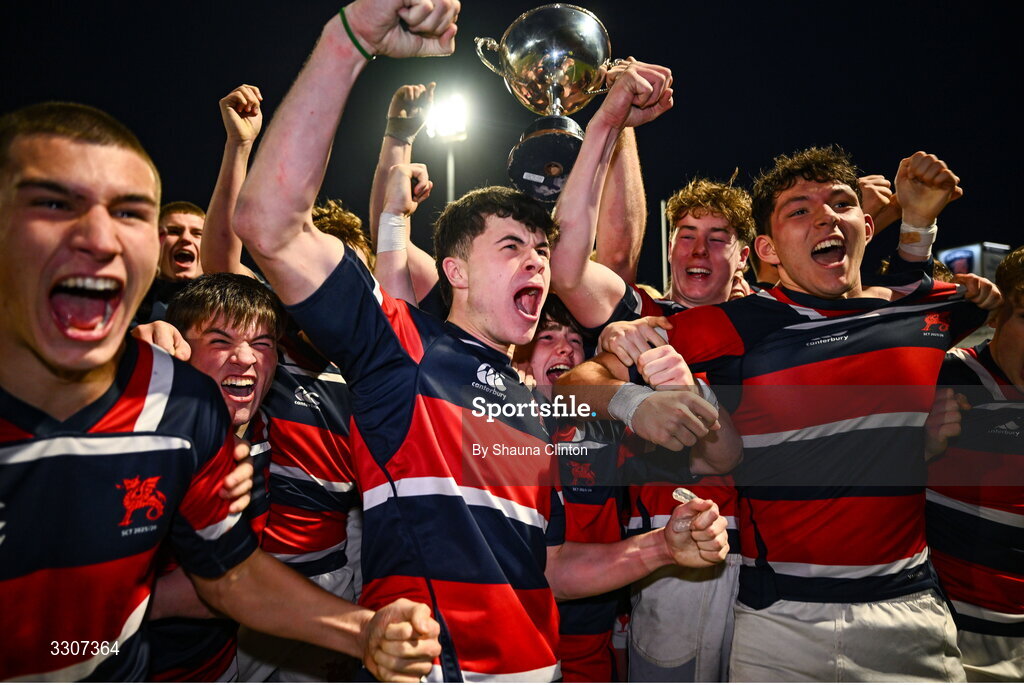 10 December 2025; Wesley College players, including Max Colbert, centre, celebrate with the cup after their side's victory in the Bank of Ireland Leinster Rugby Schools Senior League Division 1A final match between Newbridge College and Wesley College at Energia Park in Dublin. Photo by Shauna Clinton/Sportsfile
