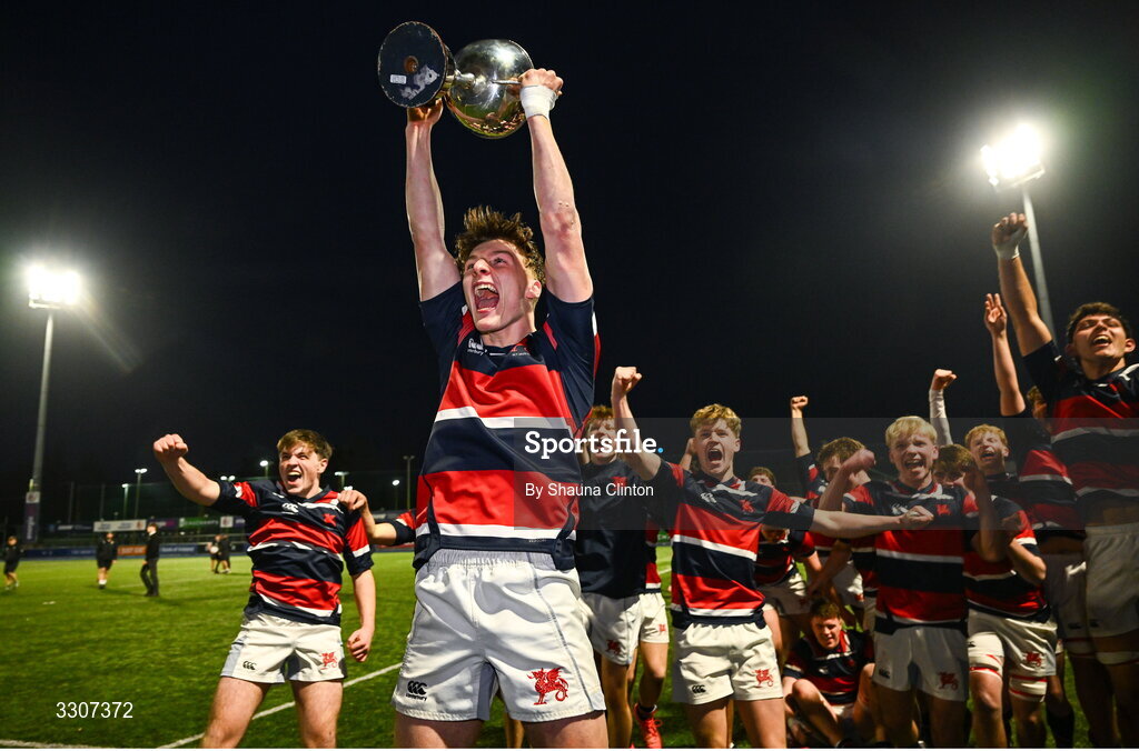 10 December 2025; Wesley College players, including Ruairi Fox, centre, celebrate with the cup after their side's victory in the Bank of Ireland Leinster Rugby Schools Senior League Division 1A final match between Newbridge College and Wesley College at Energia Park in Dublin. Photo by Shauna Clinton/Sportsfile