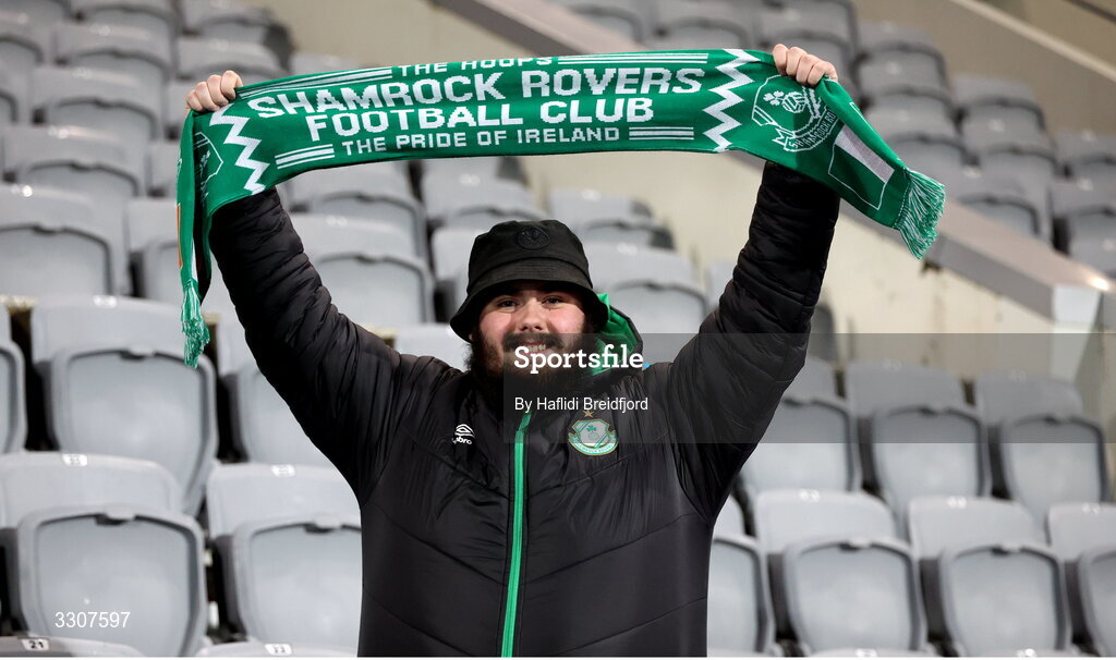 11 December 2025; A Shamrock Rovers supporter before the UEFA Conference League 2025/26 league phase match between Breidablik and Shamrock Rovers at Laugardalsvöllur in Reykjavik, Iceland. Photo by Haflidi Breidfjord/Sportsfile