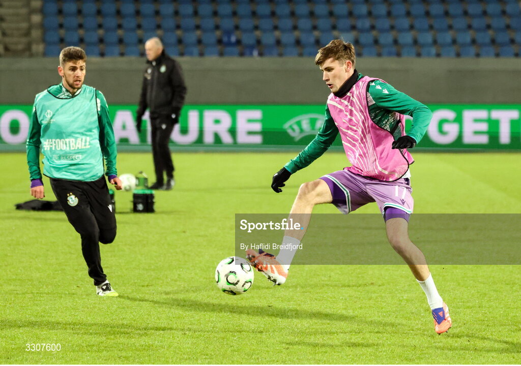 11 December 2025; Matt Healy, right, and Dylan Watts of Shamrock Rovers before the UEFA Conference League 2025/26 league phase match between Breidablik and Shamrock Rovers at Laugardalsvöllur in Reykjavik, Iceland. Photo by Haflidi Breidfjord/Sportsfile